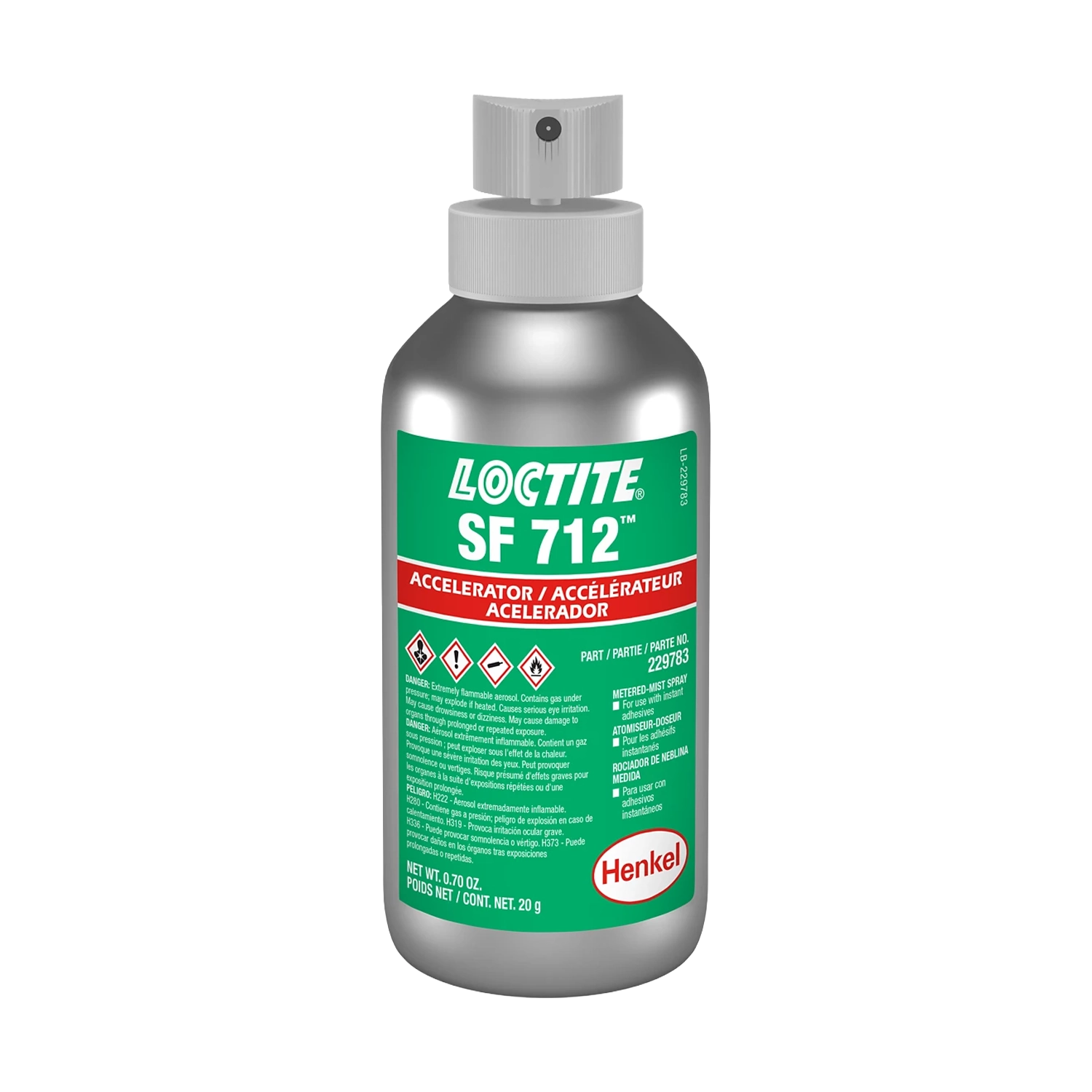 Loctite SF-712 instant adhesive is a 0.70 fl oz curing accelerator for cyanoacrylate glues used on plastics, rubbers, and porous materials.