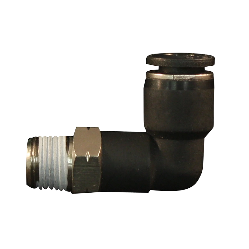 It features a 5/16″ tube push-to-connect inlet and a 1/4″ NPT male thread outlet, making it perfect for quick installations where angled connections are necessary—such as in tight spaces behind equipment, inside enclosures, or along machine panels.