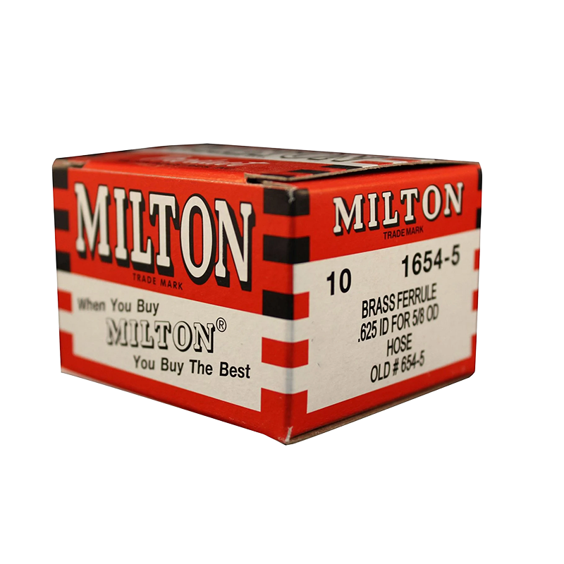 Milton 1654‑5 ⅝″ OD Brass Hose Ferrule (Box of 10) is a solid brass ferrule sized for ⅝″ OD hoses (0.625″ ID), used to create secure, custom air/fluid hose assemblies—durable and precise.