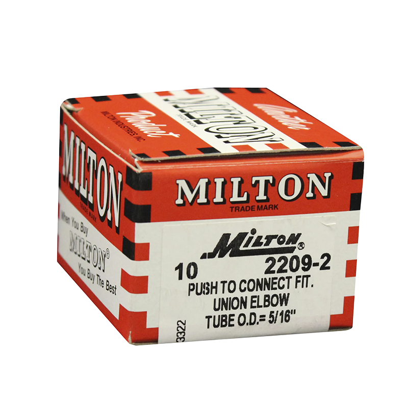 Whether deployed in a professional automotive shop or an industrial production line, the Milton 2209‑2 push-to-connect elbow union 5/16″ OD enhances efficiency by supporting quick changes and reducing downtime. It’s sold individually or in convenient packs (e.g., box of 10), offering cost-effective solutions for stocking and usage.