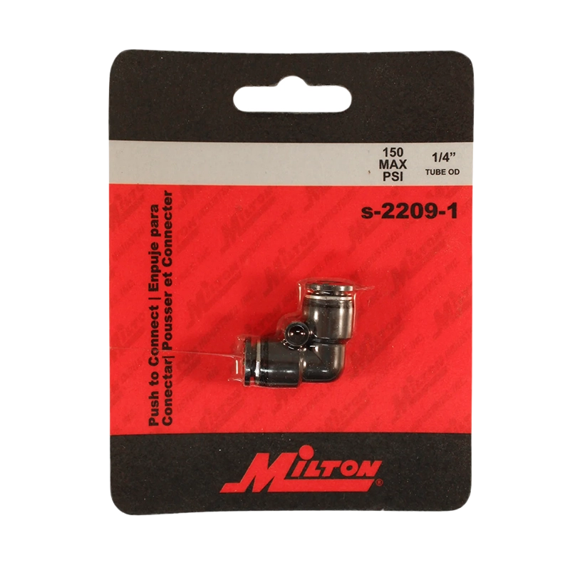 Milton push-in elbow fitting 2209-1 enables fast and secure 1/4″ tubing connections in pneumatic systems requiring a 90° turn.