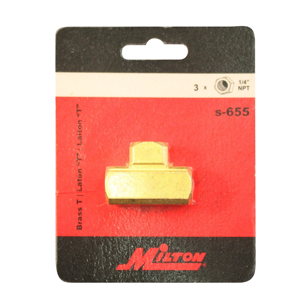 Milton T fitting 655 features three 1/4″ female NPT ports, perfect for branching air lines in pneumatic systems.